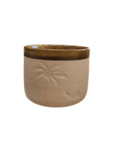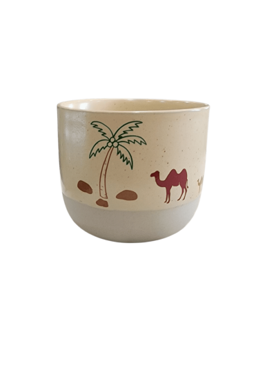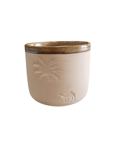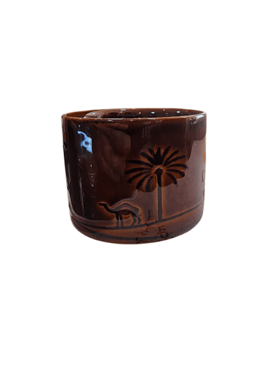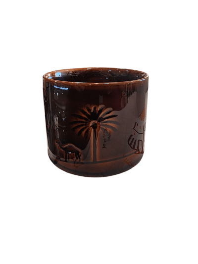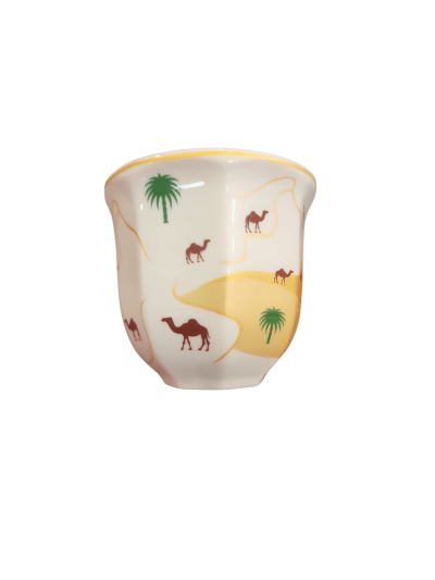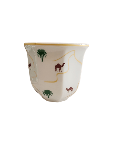 فنجان قهوة عربي فاخر بتصميم تراثي – نقش نخلة وجمل – لون بني لامع