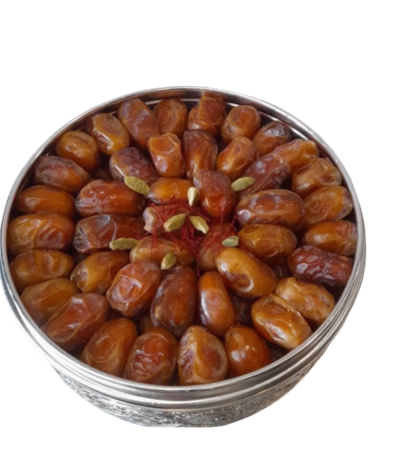 تمرية السعادة تمر بالهيل والزعفران علبة فضية 1 كيلو