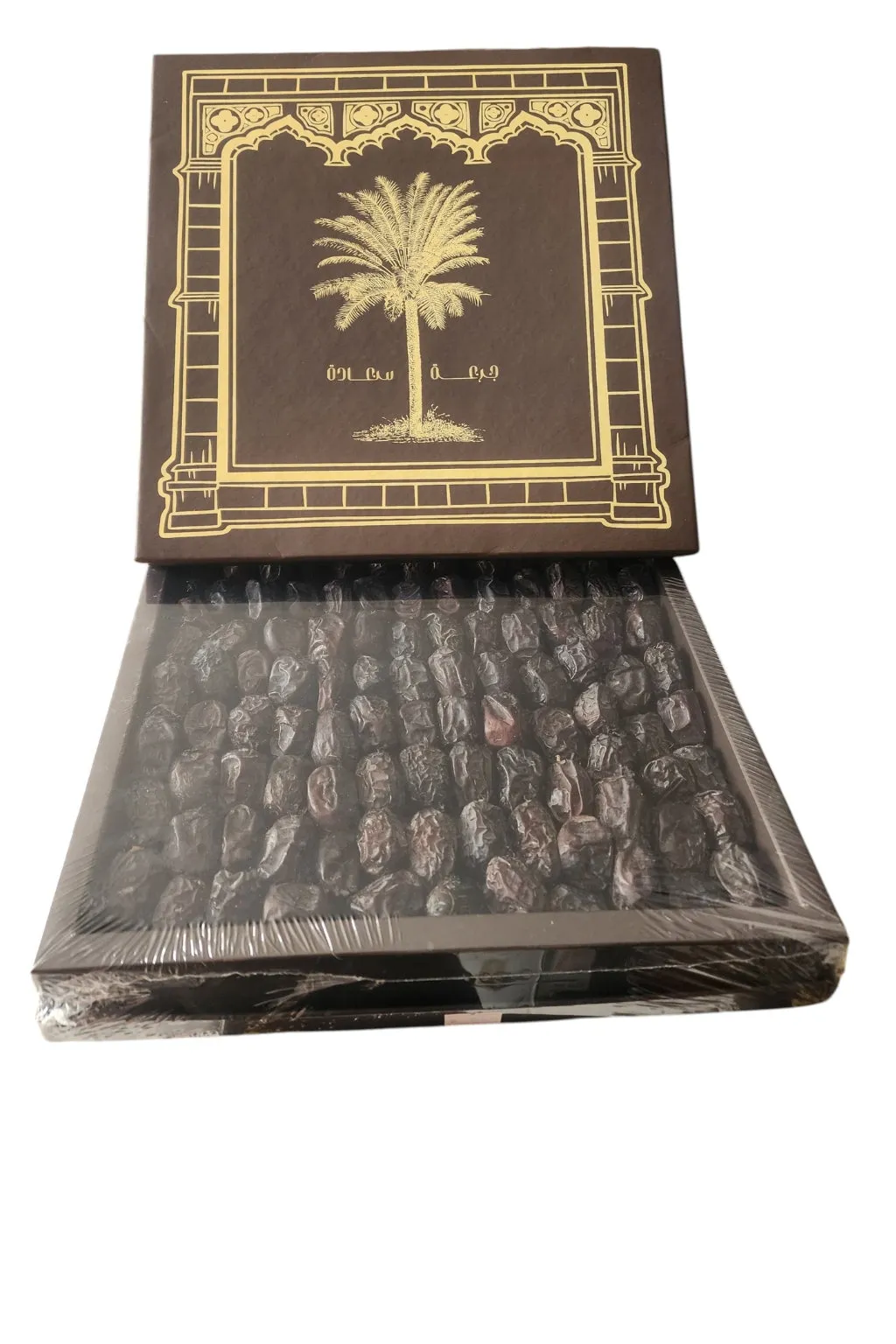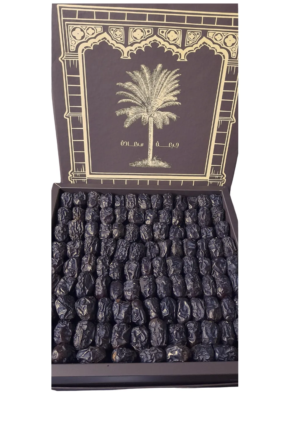 The dates come carefully arranged in a luxurious gift box, printed with a golden palm tree design and the "Paradise of Happiness" logo, and wrapped in a transparent layer to preserve their freshness and flavor. Perfect for gifting on special occasions or for entertaining your guests with the finest authentic Arabian dates, Ajwa dates from Madinah provide you with natural energy and unparalleled health benefits in every bite.