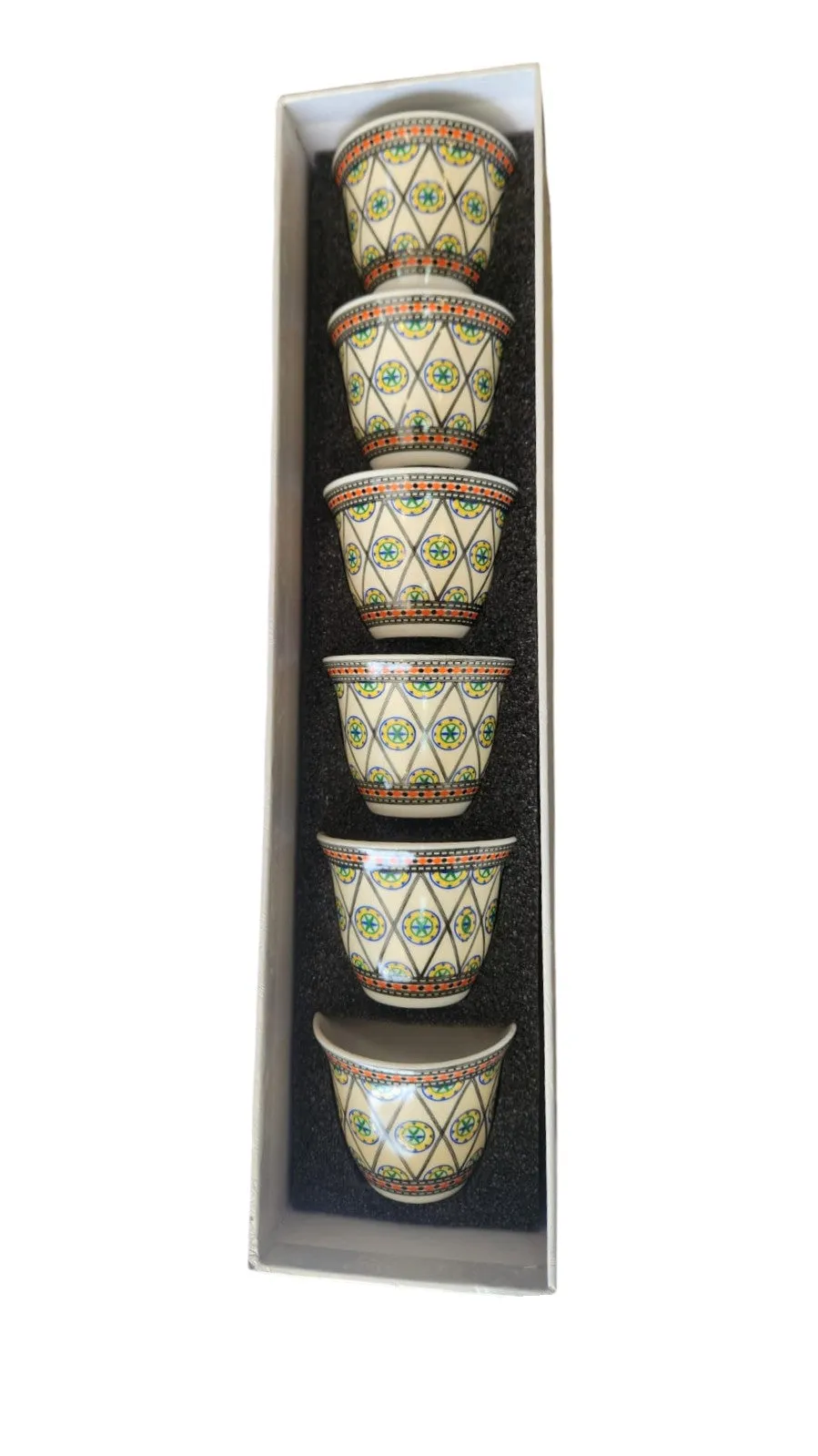 6 small coffee cups with modern traditional decorations.
