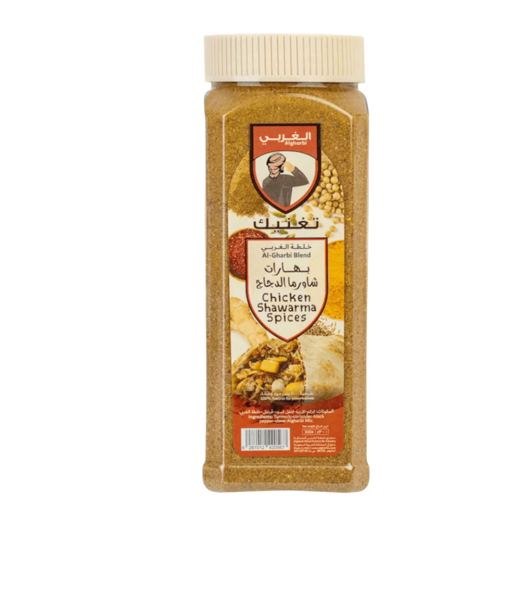 Western spices for chicken shawarma This is a spice blend specifically designed for preparing chicken shawarma, and it comes from the "Al-Gharbi" brand, known for the quality of its spices. These spices enhance the flavor of chicken shawarma and add a distinctive touch to the dish.
