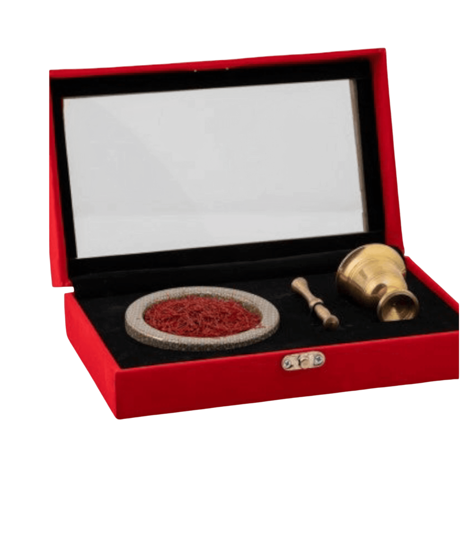 Product: This luxurious box offers a sophisticated experience for saffron lovers, containing a saffron mortar and pestle and a premium saffron container. The box's velvet design adds a touch of elegance, making it an ideal gift for friends and family or for special occasions.