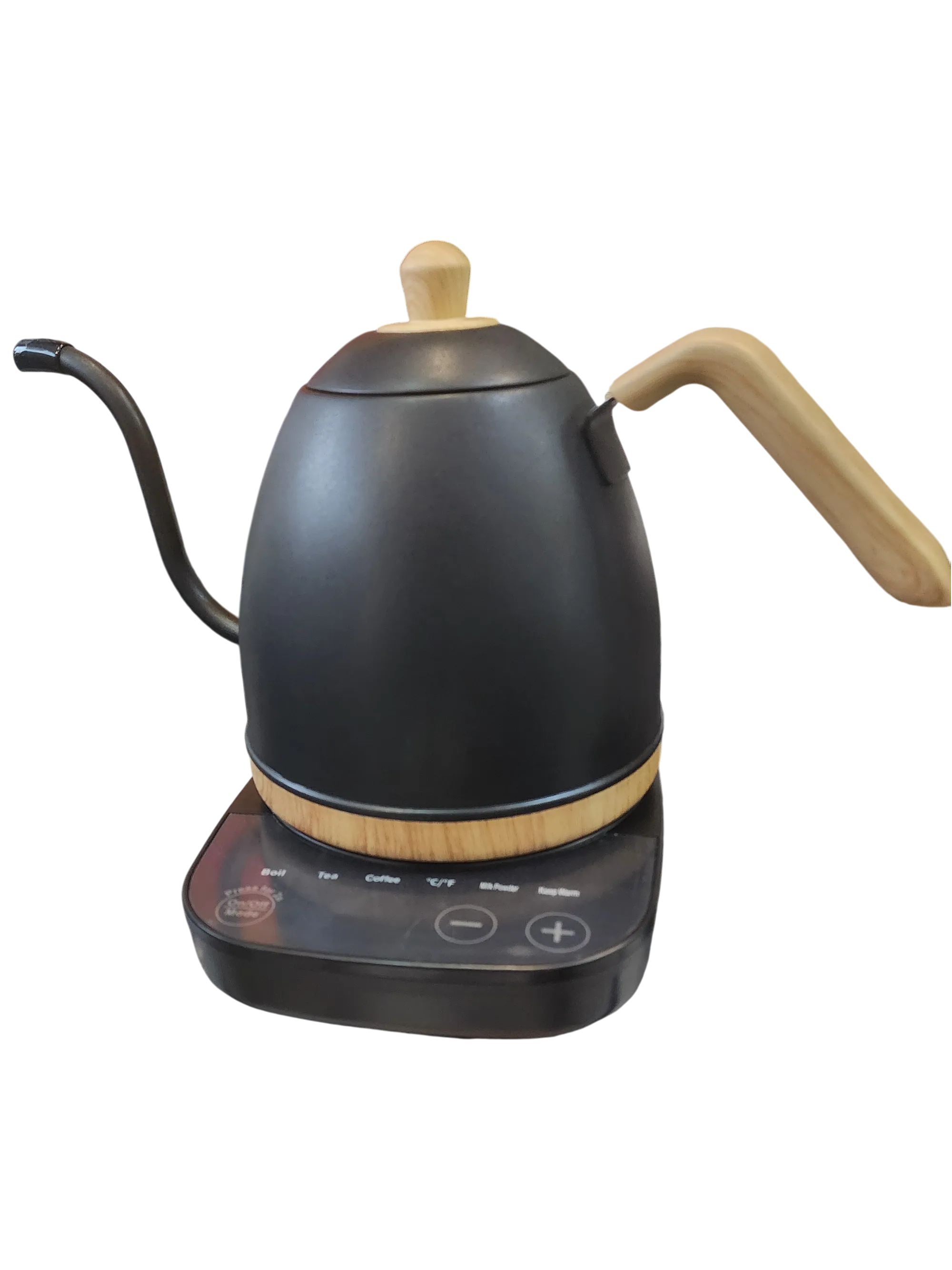Elevate your coffee and tea preparation experience with Smart electric kettle It has a modern design and a comfortable wooden handle.