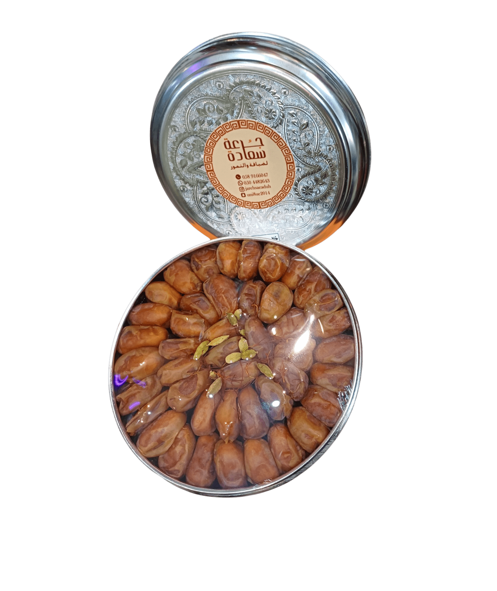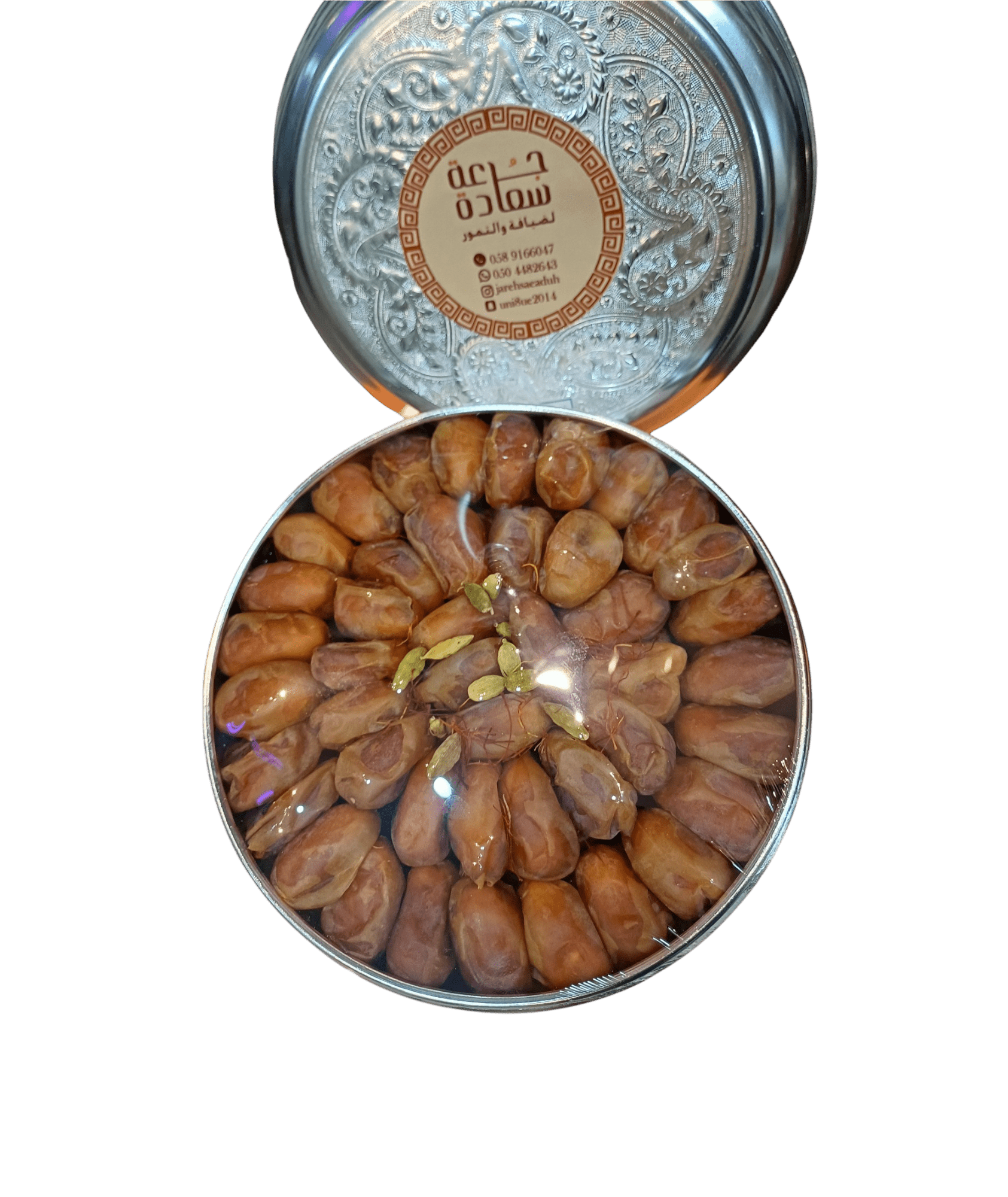 Product: Dates with cardamom and saffron in a large iron tin is a luxurious product that combines the rich, natural flavor of dates with hints of aromatic cardamom and precious saffron. This unique combination offers a sumptuous and enjoyable dining experience, reflecting a dedication to quality and attention to detail.