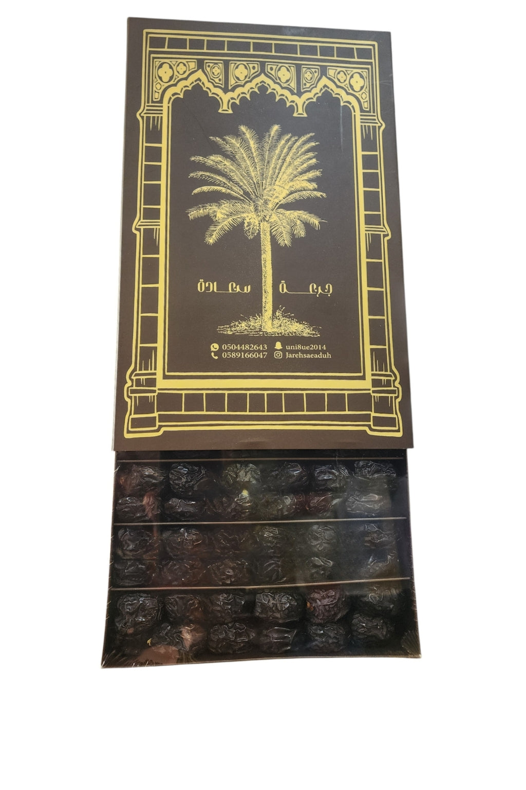تأتي الحبات مرتبة بعناية في علبة هدايا فخمة، مطبوعة برسمة نخلة ذهبية مع شعار “جنة سعادة”، ومغلفة بطبقة شفافة تحافظ على الطراوة والنكهة داخلها. مثالية للإهداء في المناسبات الخاصة أو لضيافة ضيوفك بأرقى أنواع التمر العربية الأصيلة، يوفّر لك تمر عجوة المدينة طاقة طبيعية وفوائد صحية لا تضاهى في كل لقمة.