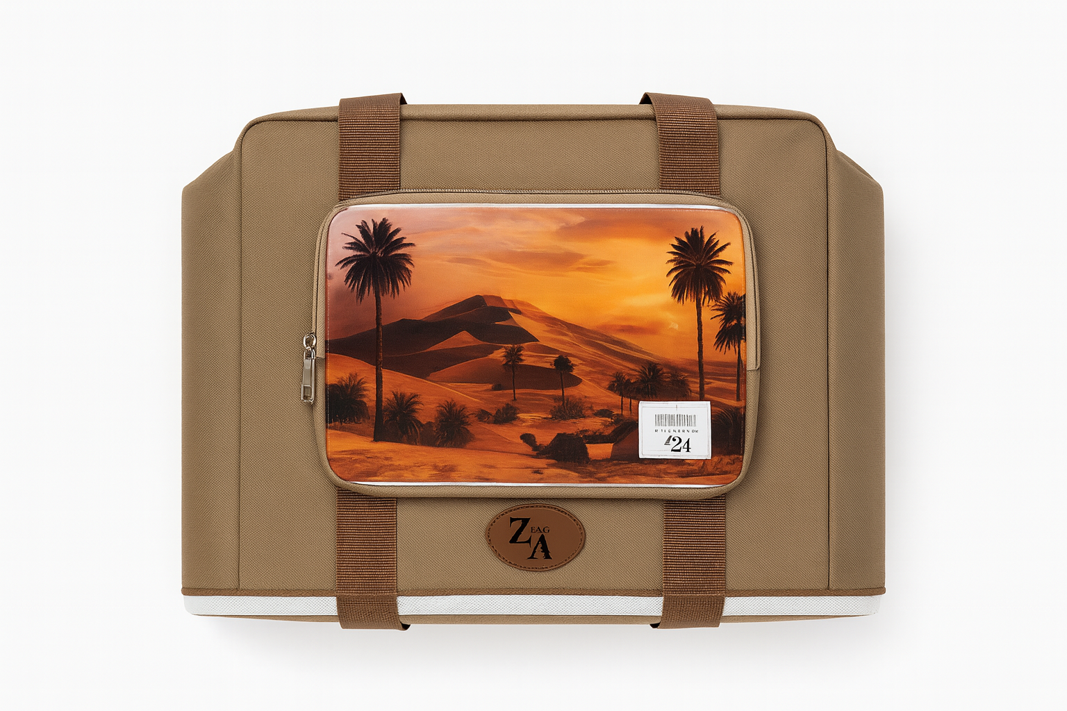 ارتقِ بضيافتك مع هذه الحافظة الفاخرة للترامس ذات التصميم العصري والجودة العالية. تأتي الشنطة بلون بيج جذاب مع جيب أمامي برسمة صحراوية مذهلة تعكس جمال الطبيعة العربية وروح الصحراء.
