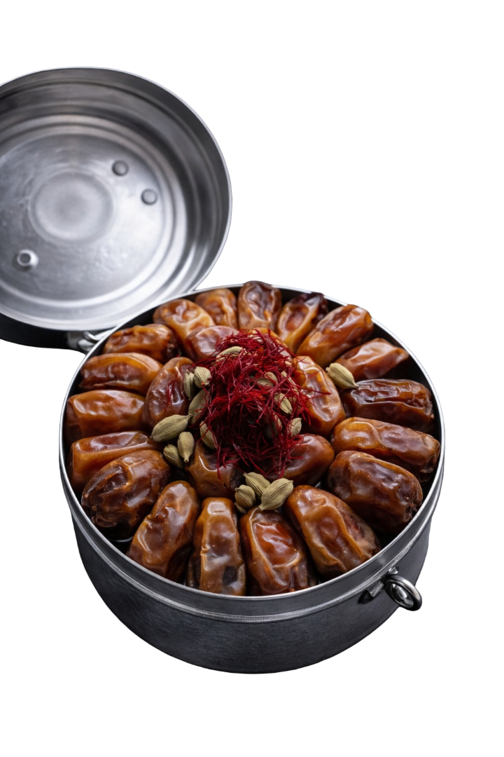 المنتج: تمر بالهيل والزعفران في علبة حديد كبيرة هو منتج فاخر يجمع بين نكهة التمر الطبيعية الغنية مع لمسات من الهيل العطري والزعفران الثمين. يوفر هذا التكوين الفريد تجربة تناول فاخرة وممتعة، ويعكس التفاني في الجودة والتفاصيل.