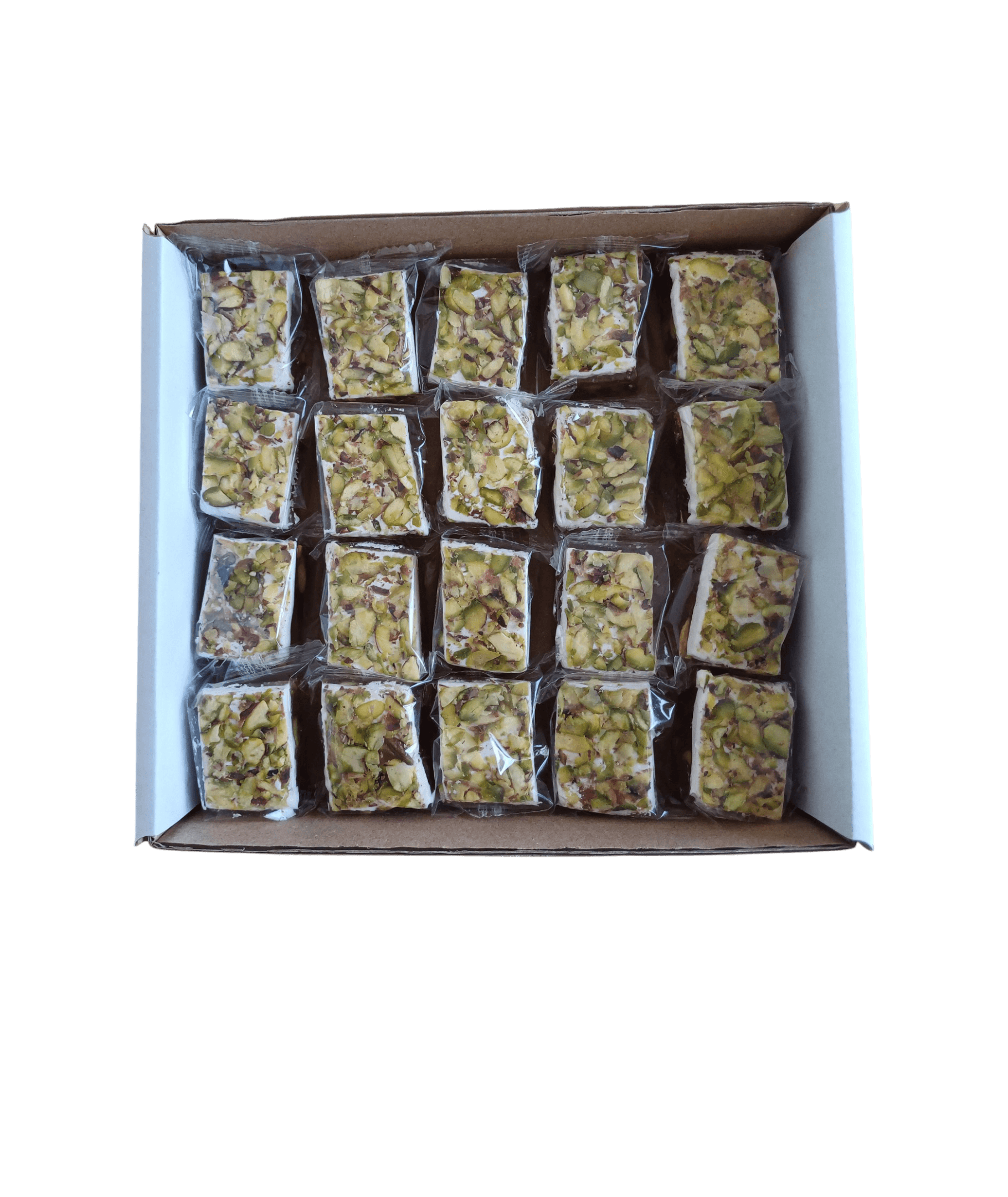 - نكهة لذيذة: تجمع الحلوى بين الطعم الحلو لنكهة سلوى والفستق الحلبي، مما يوفر تجربة مذاق غنية ومميزة. الفستق الحلبي يضيف لمسة من القرمشة والتوازن المثالي للحلاوة.