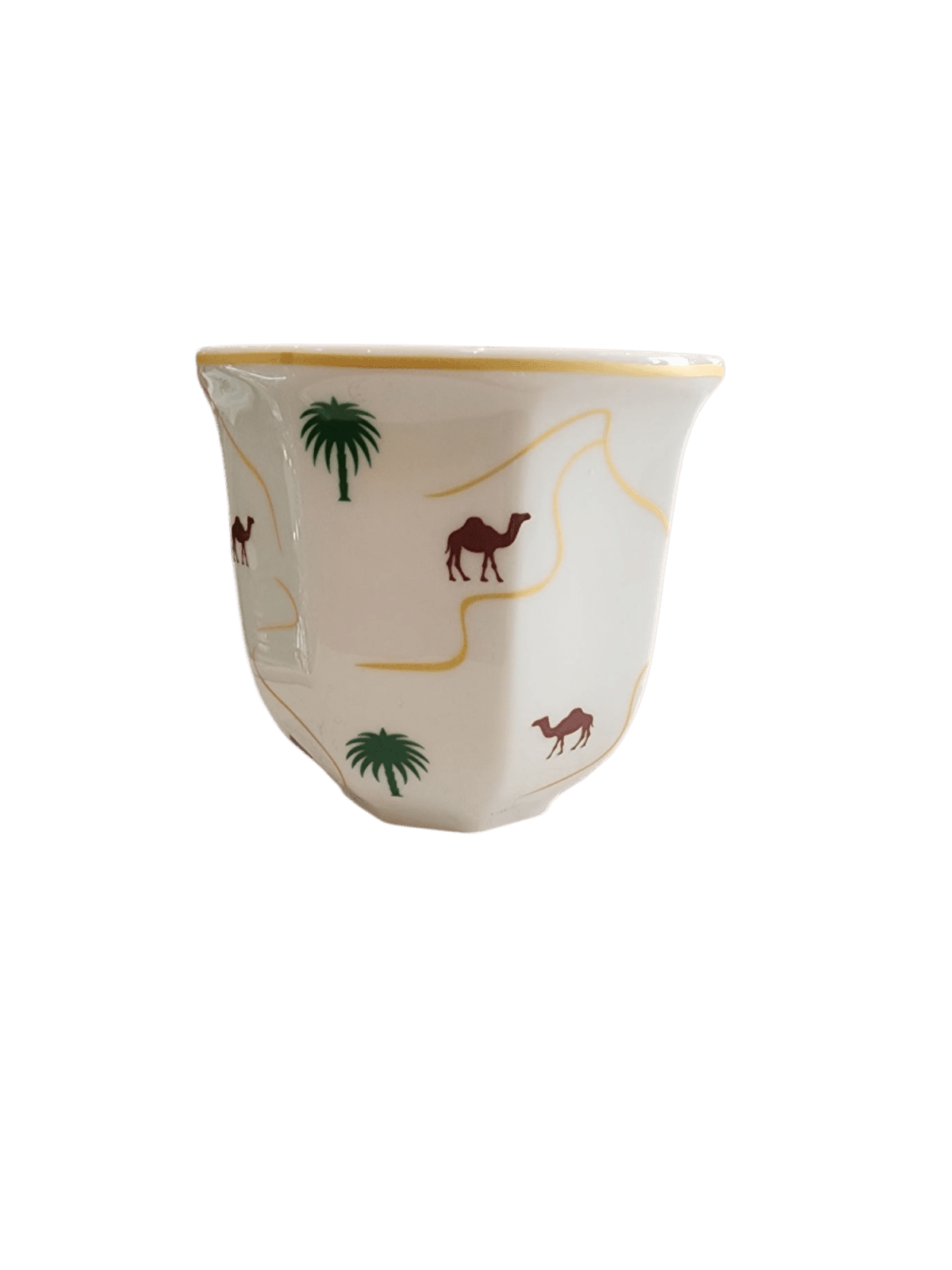 فنجان بتصميم مميز يجمع بين الشكل الهندسي العصري والزخارف التراثية، مزين برسومات النخلة والجمل مع خطوط ذهبية تضيف لمسة راقية. مثالي لتقديم القهوة العربية بأسلوب أنيق يلفت الانتباه في المجالس والضيافة.