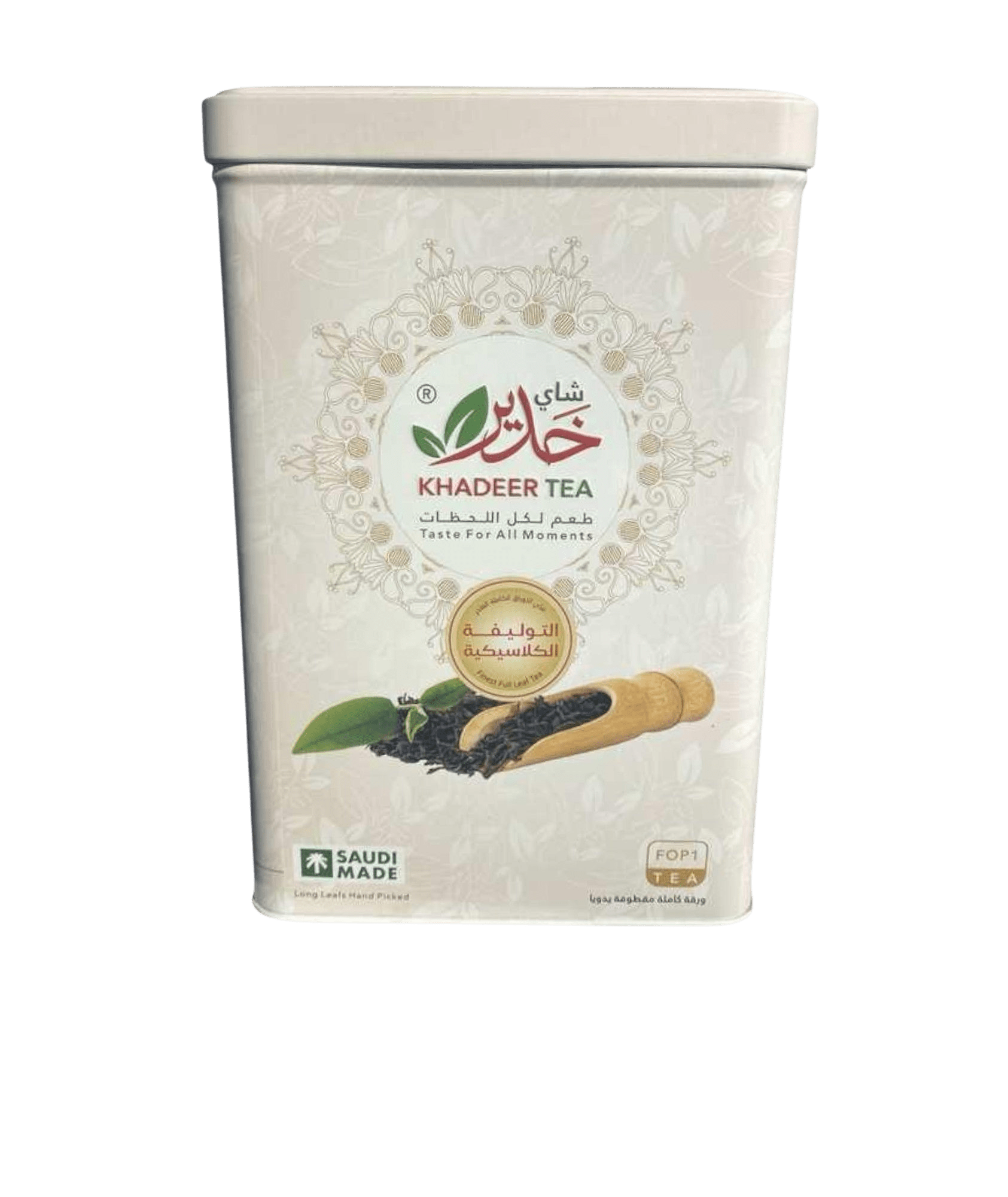 يأتي الشاي في عبوة معدنية أنيقة ومحكمة، تجمع بين التصميم الكلاسيكي والحديث، لتحافظ على نضارة الأوراق ورائحتها الطازجة. شاي خدير هو الاختيار الأمثل للاستمتاع بشاي فاخر في كل لحظة.”