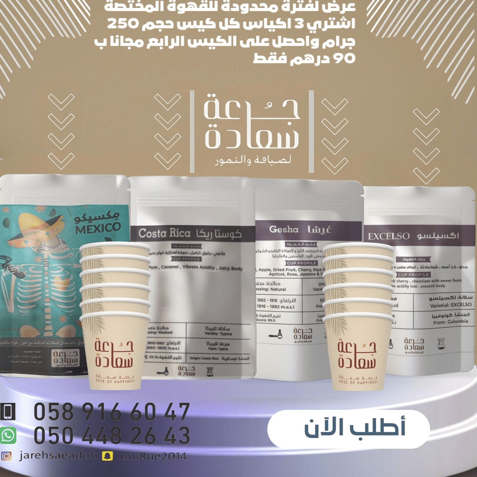 تفاصيل العرض: استمتع بعرض خاص لفترة محدودة – احصل على 3 أكياس من القهوة المختصة بحجم 250 جرام فقط مقابل 90 درهم، واحصل على الكيس الرابع مجاناً! اغتنم الفرصة الآن لتجربة القهوة الفاخرة بأسعار لا تُقاوم.
