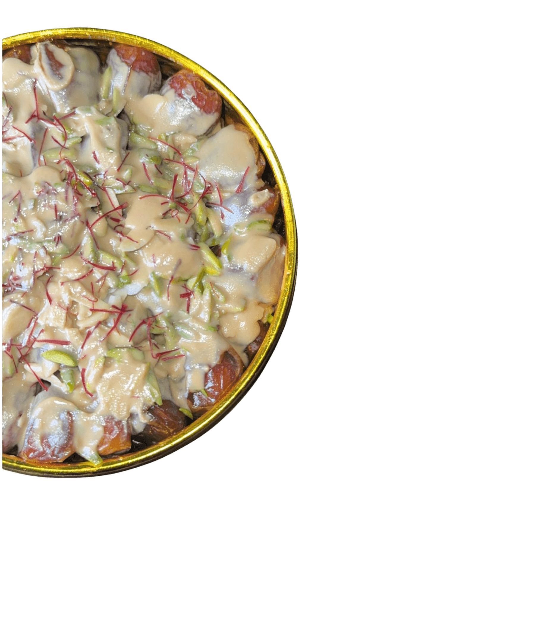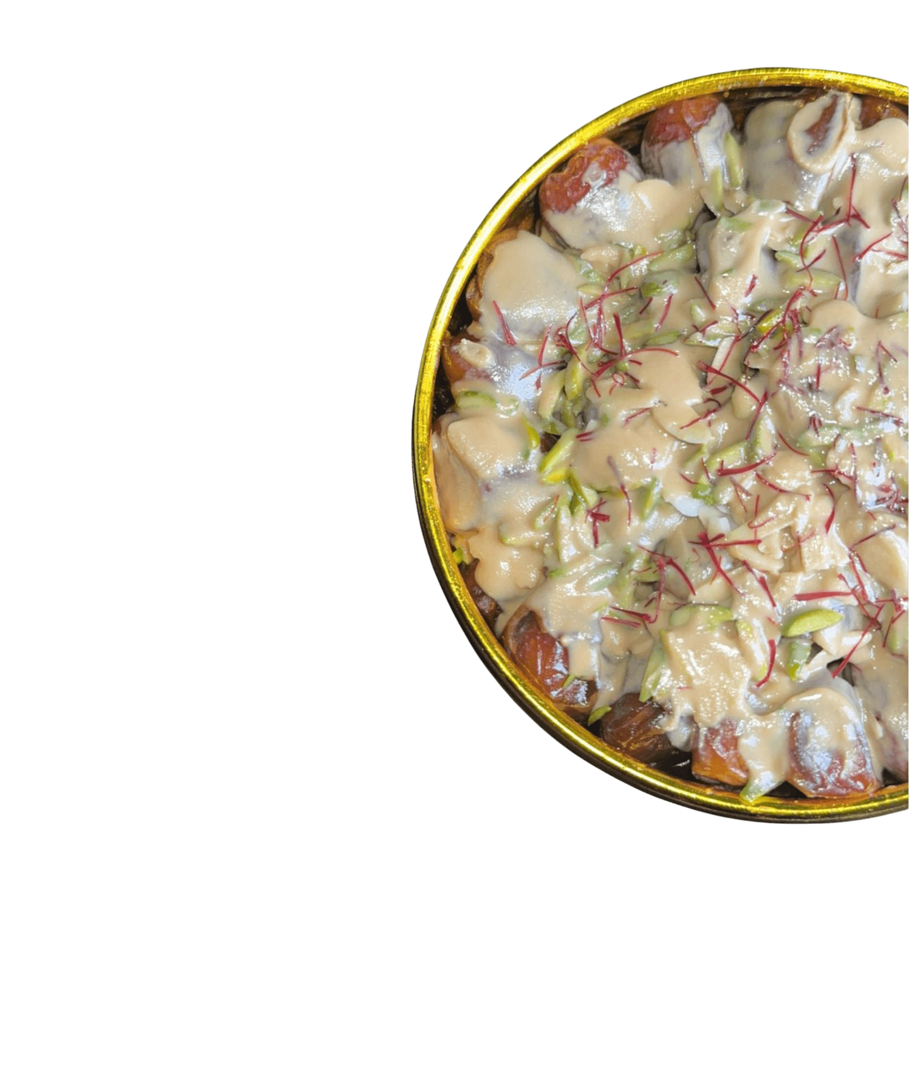 - ملمس مثالي: يتميز التمر بملمس طري وسلس من الخارج، مع قوام مقرمش من المكسرات ونكهة غنية من الزعفران والطحينة.