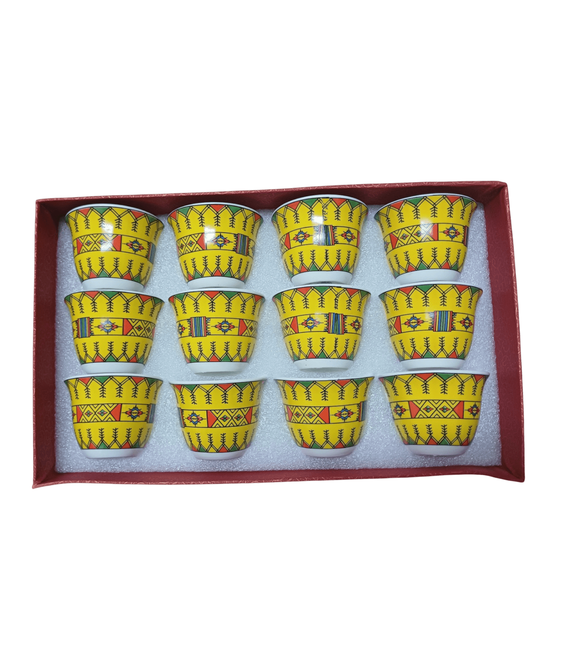 - 6 أكواب (3 شاي و3 قهوة) بتصميم مميز يتناغم مع الإبريق.